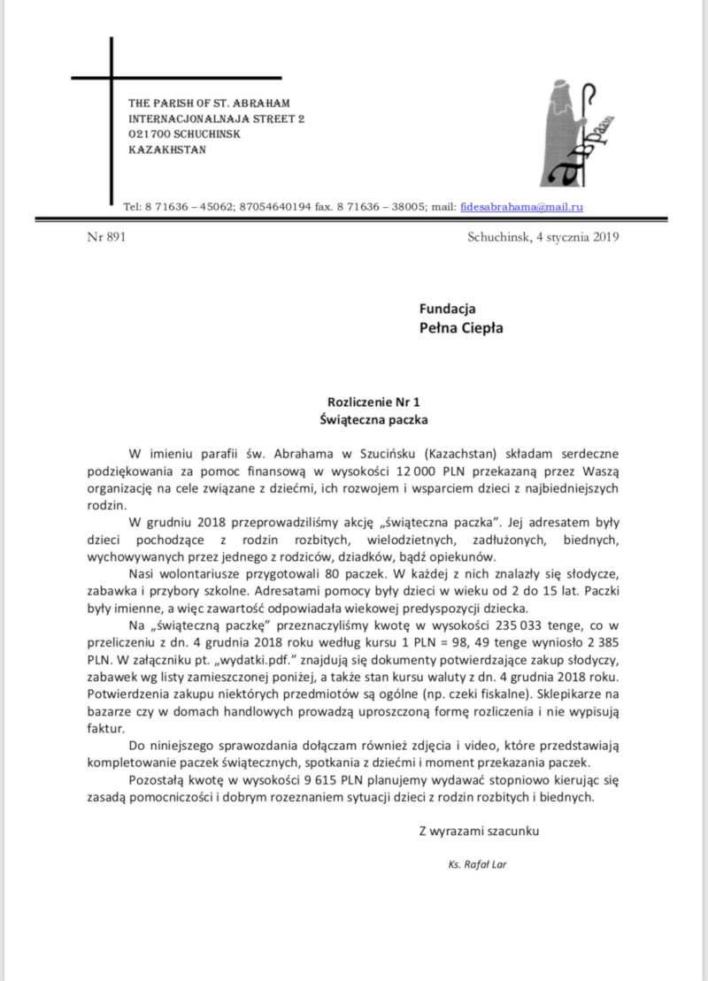 To już staje się tradycją, że Szczecińska Fundacja Pełna Ciepła dzięki pomocy darczyńców, wspiera dzieci z trudnym startem i stara się wyrównać ich szanse podczas wchodzenia w dorosłe życie. Niedawno mogliście zobaczyć na czym polega nasza pomoc dzieciom z najbiedniejszych regionów w Kazachstanie, gdzie wraz z parafią św. Abrahama zorganizowaliśmy wieczór świętego Mikołaja. Dzięki Waszej pomocy, obdarowaliśmy prezentami aż 80 dzieci w wieku od dwóch do 15 lat. Każde otrzymało słodycze, przybory szkolne i zabawkę. Dzisiaj dotarły do nas od księdza Rafała Lara podziękowania i rozliczenie projektu. Dziękujemy w imieniu wszystkich dzieci za pomoc, bez Państwa wsparcia całe przedsięwzięcie nie mogłoby się udać.